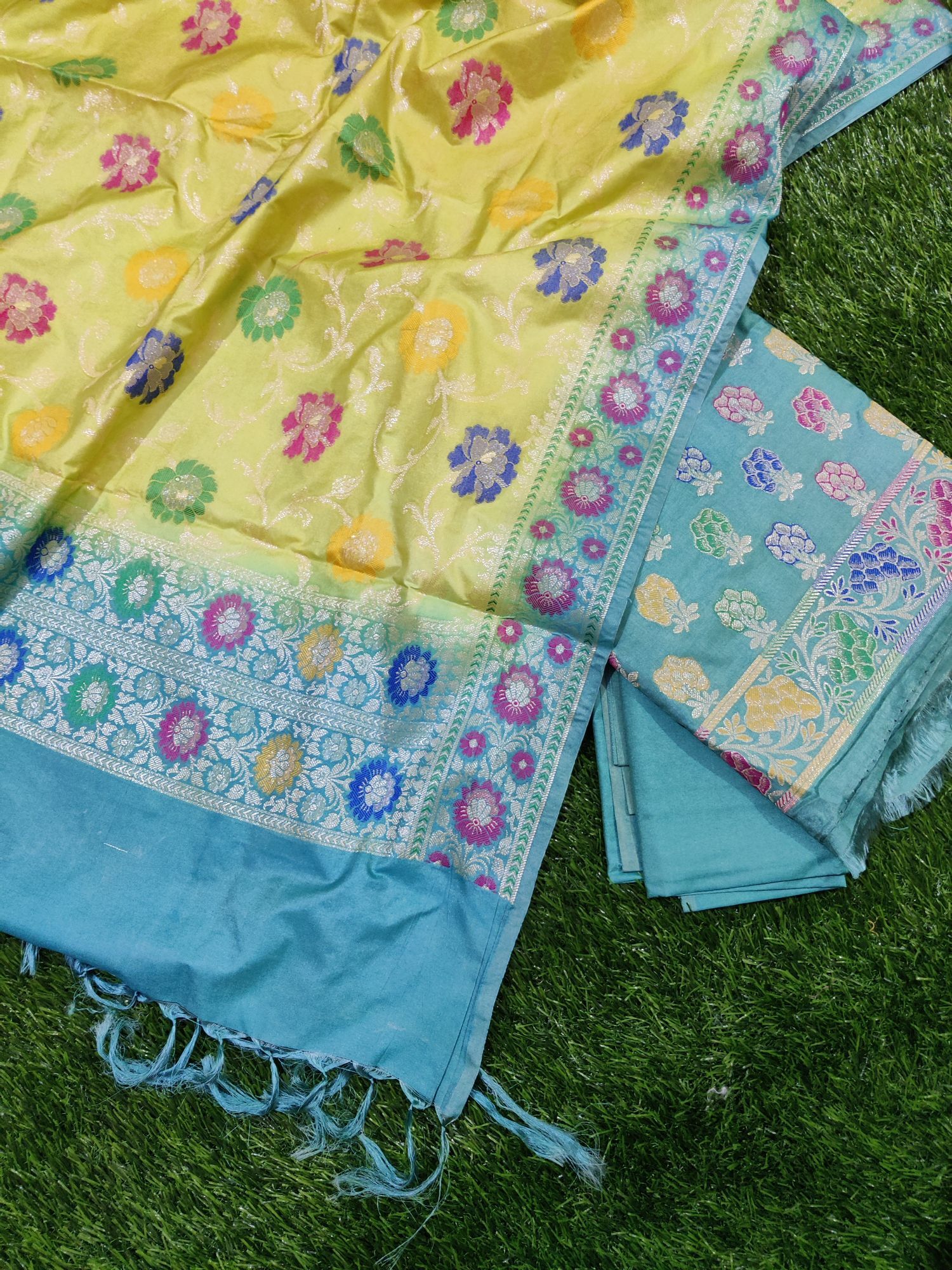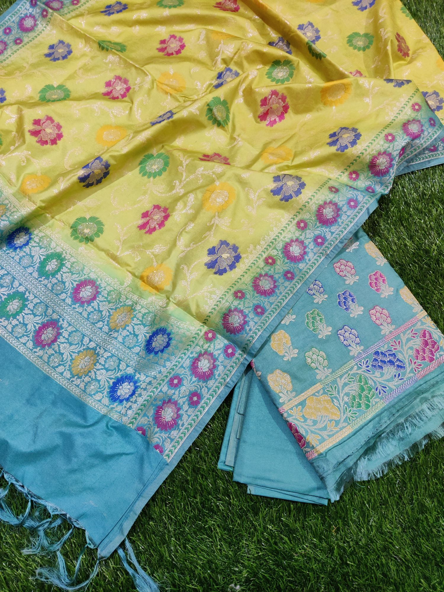 Yellow & Sky Blue Banarasi Katan Dupion Silk Salwar Kameez Unstitched Suit Set